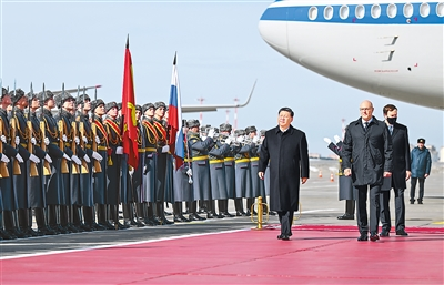當(dāng)?shù)貢r(shí)間3月20日,國(guó)家主席習(xí)近平乘專(zhuān)機(jī)抵達(dá)莫斯科,應(yīng)俄羅斯總統(tǒng)普京邀請(qǐng),對(duì)俄羅斯進(jìn)行國(guó)事訪問(wèn)。下午1時(shí)許,習(xí)近平乘坐的專(zhuān)機(jī)抵達(dá)莫斯科伏努科沃專(zhuān)機(jī)機(jī)場(chǎng)。習(xí)近平步出艙門(mén)時(shí),俄羅斯副總理切爾內(nèi)申科等政府高級(jí)官員在舷梯旁熱情迎接。俄方在機(jī)場(chǎng)舉行隆重迎賓儀式。軍樂(lè)團(tuán)奏中俄兩國(guó)國(guó)歌。這是習(xí)近平檢閱俄羅斯三軍儀仗隊(duì)并觀看分列式。新華社記者謝環(huán)馳攝
