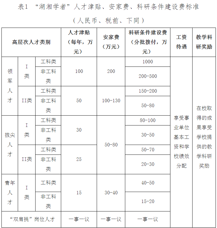 1.高層次人才按照《長(zhǎng)沙理工大學(xué)“湖湘學(xué)者”人才計(jì)劃實(shí)施辦法》(長(zhǎng)理工大黨〔2022〕45 號(hào))確定薪酬待遇(見表1),提供相應(yīng)安家費(fèi)和科研啟動(dòng)費(fèi),并提供免費(fèi)過渡性住房保障。