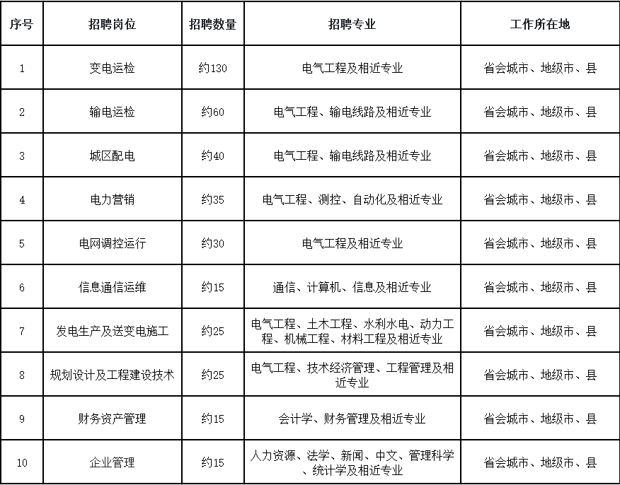 說明:1.最終招聘數(shù)量將視畢業(yè)生應聘情況、流失情況、國家電網(wǎng)有限公司核定情況做相應調(diào)整。2.同等條件下,退役軍人優(yōu)先錄用。