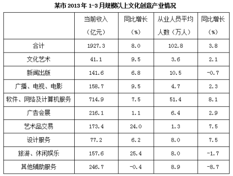 【答案】A【解析】題干要求找出2013年一季度平均每名從業(yè)人員創(chuàng)造的收入高于上年的產(chǎn)業(yè),即判斷平均數(shù)的變化。平均每名從業(yè)人員創(chuàng)造的收入=當(dāng)前收入÷從業(yè)人員平均人數(shù),只需找出當(dāng)前收入增長率>從業(yè)人員平均人數(shù)增長率的產(chǎn)業(yè)即可。材料中符合條件的產(chǎn)業(yè)有文化藝術(shù)(9.5%>2.1%),新聞出版(6.8%>-0.7%),廣播、電視、電影(9.5%>2.3%),藝術(shù)品交易(24.0%>7.5%),旅游、休閑娛樂(25.4%>-1.7%),其他輔助服務(wù)(-0.4%>-8.7%),結(jié)合選項(xiàng),選擇A項(xiàng)。