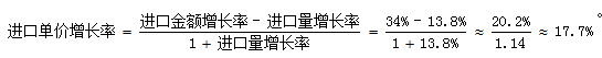 可見總量是“進(jìn)口金額”,份數(shù)是“進(jìn)口量”;再結(jié)合選項(xiàng)“增長/減少百分之幾”,可知求平均數(shù)的增長率。第一步,判斷平均數(shù)增減情況。進(jìn)口金額增長率為34%,進(jìn)口量增長率為13.8%,34%>13.8%,根據(jù)“