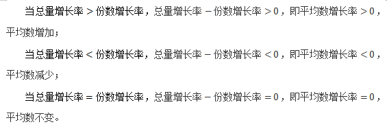 ”,若該式為正,則現(xiàn)期平均數(shù)較基期的上升;若該式為負(fù),則現(xiàn)期平均數(shù)較基期的下降。其中,“1+份數(shù)增長率”一般為正,所以,判斷平均數(shù)變化只需比較總量增長率和份數(shù)增長率的大小即可。分如下三種情況: