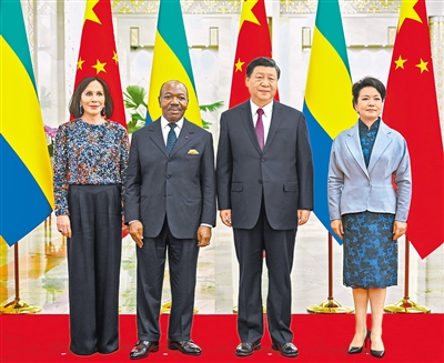 四月十九日下午,國家主席習近平在北京人民大會堂同來華進行國事訪問的加蓬總統(tǒng)邦戈舉行會談。這是會談前,習近平和夫人彭麗媛同邦戈和夫人西爾維婭合影。新華社記者李學仁攝