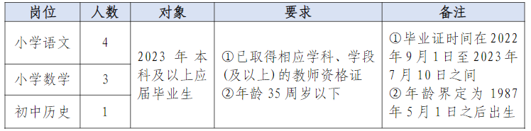 招聘教師8名,分別為小學(xué)語文崗位4人、小學(xué)數(shù)學(xué)崗位3人,初中歷史崗位1人。