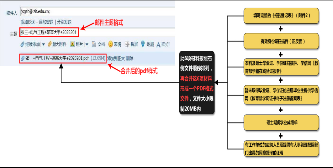 3報名注意事項。報名材料按以下順序排列,再合并所有材料形成單個PDF格式文件,文件大小限制在20MB內(nèi)(如圖1)。