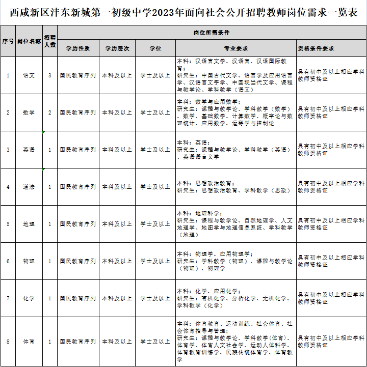 招聘崗位所需的具體條件以附件《西咸新區(qū)灃東新城第一初級(jí)中學(xué)2023年面向社會(huì)公開招聘教師崗位需求一覽表》的要求為準(zhǔn)。