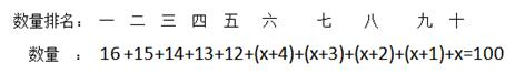 根據(jù)和定最值問題的解題原則:若要求某個(gè)量為最大,其他量要盡量小。要排名最后的城市專賣店數(shù)量最多,那么其他城市專賣店數(shù)量要盡可能地少。題目中唯一確定量,就是數(shù)量第五多的城市有12家,如果數(shù)量第一多到第四多城市的專賣店數(shù)量要想盡量小,且數(shù)量不一樣,還要比數(shù)量第五的城市大,那么就應(yīng)該是16,15,14,13家;同理,數(shù)量第六多到數(shù)量排名第十一要盡量小,且都比數(shù)量排名最后的城市大,那么每個(gè)城市的專賣店數(shù)量盡可能地接近。根據(jù)這個(gè)思想,我們可以設(shè)數(shù)量排名最后的城市有x家專賣店,數(shù)量第六多到數(shù)量排名第九的城市可設(shè)為x+4、x+3、x+2、x+1。我們把10家城市的專賣店數(shù)量已經(jīng)分別設(shè)置好未知數(shù)和常量,總和為100,故有: