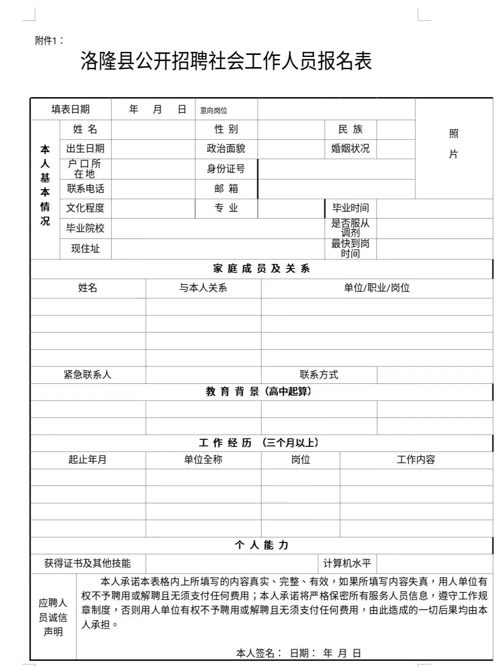 (1)洛隆縣公開(kāi)招聘鄉(xiāng)鎮(zhèn)社會(huì)工作人員報(bào)名表(電子版與紙質(zhì)版),詳見(jiàn)附件1;