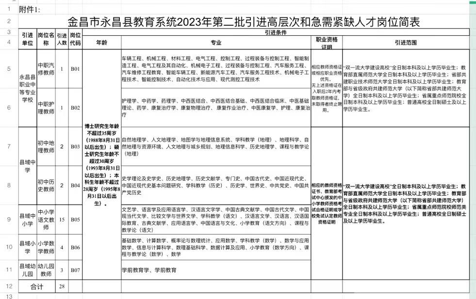1.金昌市永昌縣教育系統(tǒng)2023年第二批引進(jìn)高層次和急需緊缺人才崗位簡(jiǎn)表