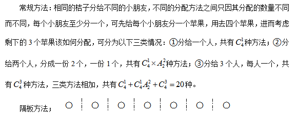 如圖所示,假設(shè)〇表示7個(gè)相同的桔子,要想把桔子分成四份,分給四個(gè)不同的小朋友,可考慮用隔板將其分成4份,每份至少一個(gè),按順序分給四個(gè)人即可;7個(gè)桔子中間產(chǎn)生6個(gè)空隙可放隔板,故從6個(gè)空隙中選出3個(gè)空隙放入隔板即可分成四份。故分配方法為