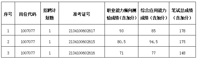 按照筆試成績(達(dá)到最低控制合格分?jǐn)?shù)線且無任一科成績低于60分)從高分到低分順序,根據(jù)招聘崗位計劃數(shù),按1:3比例確定各崗位專業(yè)測試入圍人選(最后一名有數(shù)名考生筆試成績相同的,一并確定為入圍人選),專業(yè)測試入圍人選參加資格復(fù)審,入圍人選名單見附件。
