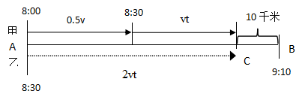 例2:甲車上午8點(diǎn)從A地出發(fā)勻速開往B地,出發(fā)30分鐘后乙車從A地出發(fā)以甲車2倍的速度前往B地,并在距離B地10千米時(shí)追上甲車。如乙車9點(diǎn)10分到達(dá)B地,問:甲車的速度為多少千米/時(shí)( )?