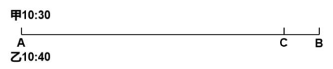 【答案】C【解析】根據(jù)題干條件作圖如下,甲、乙兩車均從A地出發(fā),假設(shè)在C地乙車追上了甲車,那么此時(shí)甲、乙兩車行駛的路程相同(均為AC),已知兩車的速度比為5:6,則時(shí)間之比為6:5,甲比乙多用了1份時(shí)間,對(duì)應(yīng)甲比乙早出發(fā)的10分鐘,則甲從A地到C地用時(shí)6×10=60分鐘=1小時(shí),所以甲在11點(diǎn)半被乙追上,故選C。