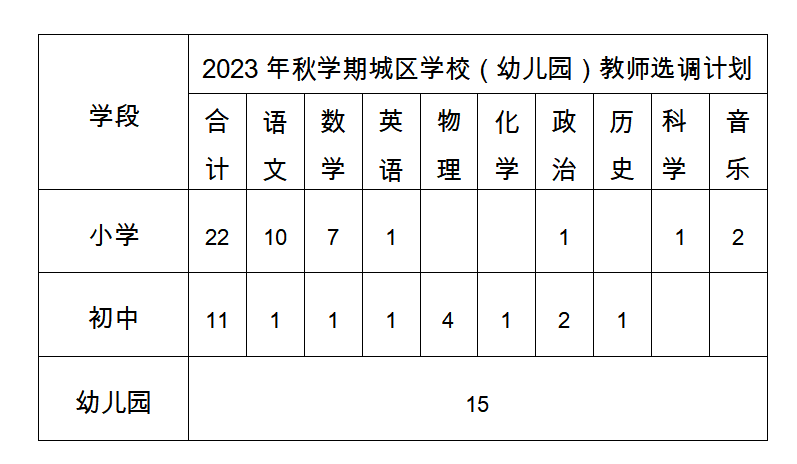 根據(jù)工作需要,經(jīng)縣委編委批準(zhǔn),2023年城區(qū)學(xué)校公開選調(diào)教師48名(初中11名、小學(xué)22名、幼兒園15名),現(xiàn)將有關(guān)事項(xiàng)公告如下: