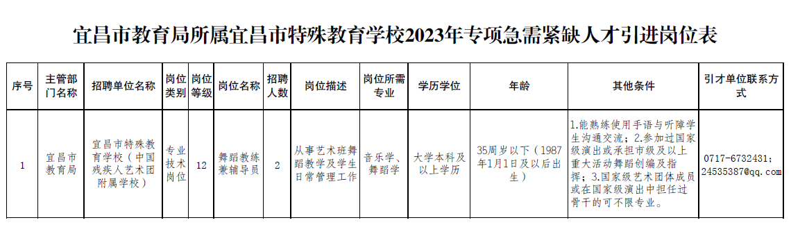 宜昌市教育局所屬宜昌市特殊教育學(xué)校2023年專項(xiàng)急需緊缺人才引進(jìn)公告