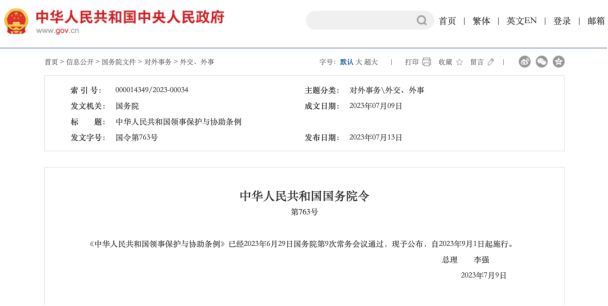 近日,中國政府網(wǎng)公布《中華人民共和國領(lǐng)事保護與協(xié)助條例》,自2023年9月1日起施行。