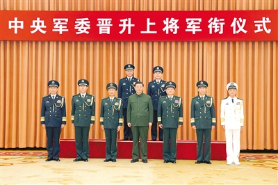 晉銜儀式在嘹亮的軍歌聲中結(jié)束。隨后,習(xí)近平等領(lǐng)導(dǎo)同志同晉升上將軍銜的軍官合影。