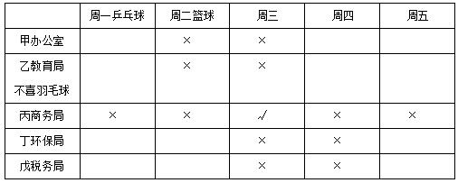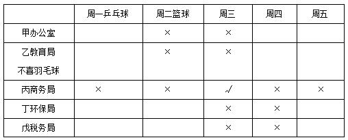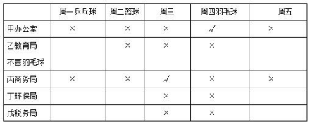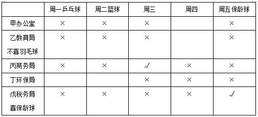 【答案】C【解析】根據(jù)上表可知,丙在商務(wù)局工作,周三休息,不可能喜歡乒乓球和籃球,只有C項(xiàng)符合。