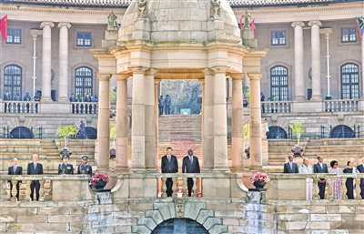 8月的比勒陀利亞,晴空萬里,惠風(fēng)和暢。總統(tǒng)府廣場(chǎng)鮮花盛開,中南兩國(guó)國(guó)旗迎風(fēng)飄揚(yáng)。在總統(tǒng)摩托車隊(duì)護(hù)衛(wèi)下,習(xí)近平乘車抵達(dá)總統(tǒng)府,拉馬福薩在下車處熱情迎接。兩國(guó)元首登上檢閱臺(tái)。儀仗隊(duì)行持槍禮,軍樂隊(duì)奏中南兩國(guó)國(guó)歌,現(xiàn)場(chǎng)鳴放21響禮炮。習(xí)近平檢閱南非儀仗隊(duì)。兩國(guó)元首同雙方陪同人員一一握手。