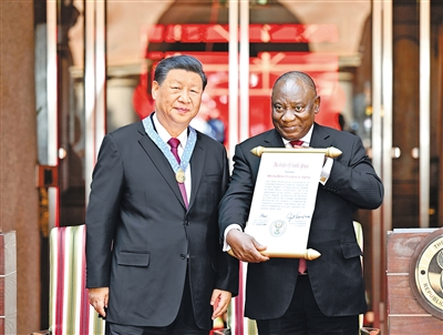 會(huì)談后,拉馬福薩向習(xí)近平授予“南非勛章”,這是南非授予重要友好國(guó)家元首的最高級(jí)別勛章和最高榮譽(yù)。