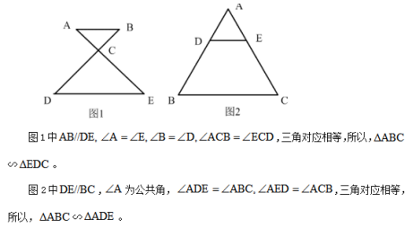 相似三角形:當兩個三角形三角對應相等或三邊對應成比例,則稱這兩個三角形為相似三角形。而在我們常見的題目中,相似三角形往往是伴隨著平行出現(xiàn)的,比如最常見的兩種相似三角形如下圖所示: