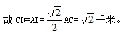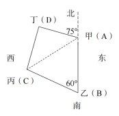 【答案】B【解析】根據(jù)題干中四人的關(guān)系,作圖如下,連接A、C。在△ABC中,AB=BC=2千米,∠B=60°,則△ABC是等邊三角形,AC=2千米,∠BAC=60°。在△ACD中,AD=CD,∠CAD=180°-∠BAC-75°=180°-60°-75°=45°,則∠DCA=45°,∠CDA=90°,△ACD是等腰直角三角形,