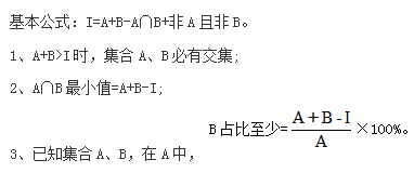 在行測資料分析中,容斥問題研究的是集合之間交叉關(guān)系的一類問題。兩者容斥問題一般研究“全集I、子集A、子集B、兩者的交集A∩B、非A且非B”之間的關(guān)系。全集I通常是整體,子集A、B是整體中的某部分,A、B重疊的部分我們叫做集合的交集,用A∩B來表示,非A且非B表示在全集I中但不在子集A、B里面的部分。