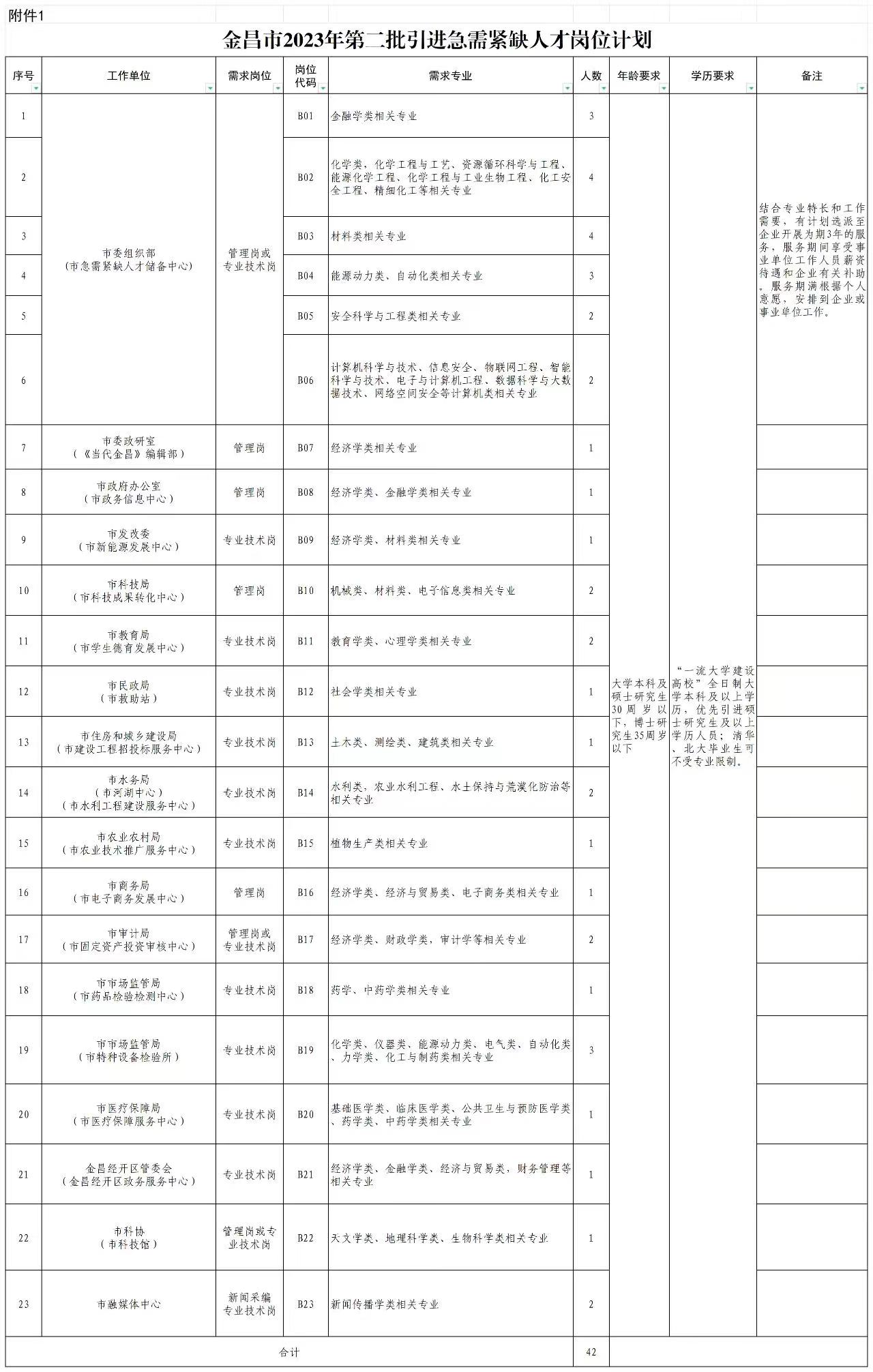 符合金昌市2023年急需緊缺人才專業(yè)需求條件的“一流大學(xué)建設(shè)高?!北究萍耙陨蠈W(xué)歷畢業(yè)生,共42名(崗位條件詳見附件1)。博士研究生和正高級專業(yè)技術(shù)人員可不受崗位條件限制,采取“一事一議”方式引進(jìn)。