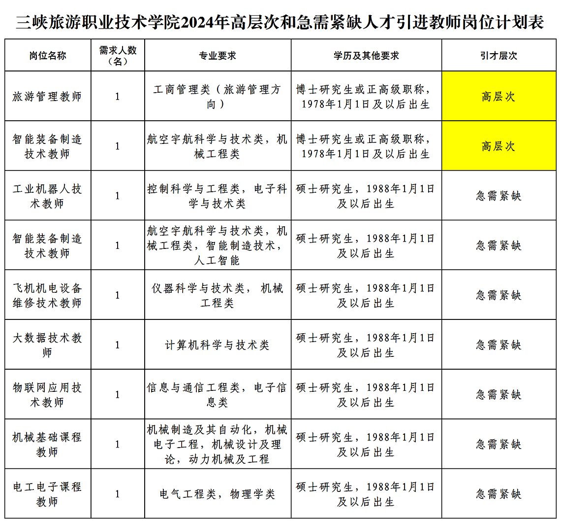 三峽旅游職業(yè)技術(shù)學院2024年高層次和急需緊缺人才引進教師公告