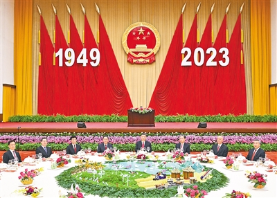 人民大會(huì)堂宴會(huì)廳華燈璀璨、鮮花綻放,洋溢著喜慶熱烈的節(jié)日氛圍。主席臺(tái)上方高懸著莊嚴(yán)的國徽,“1949—2023”大字年號(hào)在鮮艷的紅旗映襯下格外醒目。