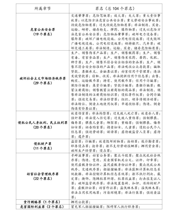 雖然我國法律并沒有對(duì)刑事諒解適用的案件范圍作出限制,但一般來說,需要有被害人的案件才可以出具刑事諒解書。經(jīng)檢索刑事裁判文書,大約有104個(gè)罪名可以出具刑事諒解書。如下表所示: