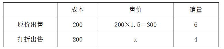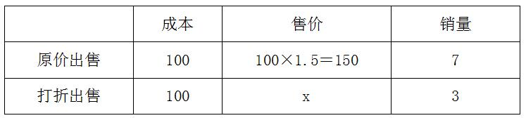 【例1】某家具店購(gòu)進(jìn)一批桌椅,每套進(jìn)價(jià)200元,按期望獲利50%定價(jià)出售。賣掉這批桌椅的60%以后,店主為提前收回資金,打折出售余下的桌椅。售完全部桌椅后,實(shí)際利潤(rùn)比期望利潤(rùn)低了18%。問(wèn)余下的桌椅是打幾折出售的?( )
