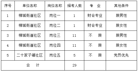 本次計(jì)劃招聘29名社區(qū)工作者,其中柳城街道新柳城、凌波、雙城社區(qū)24名,二十家子鎮(zhèn)鑫福園社區(qū)5名,從事社區(qū)日常服務(wù)、防災(zāi)減災(zāi)、夜班值守、12345平臺(tái)信息收集化解等工作,崗位信息如下。