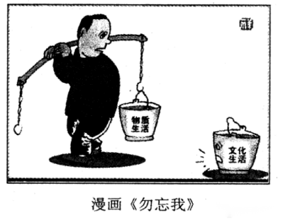 審題點(diǎn)1:“漫畫(huà)題,漫畫(huà)是一個(gè)人挑著扁擔(dān)后面是物質(zhì)生活,然后有一個(gè)同事問(wèn)‘文化生活呢?’文化生活被扔在了地上”