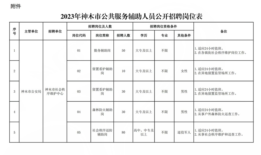 6.招聘崗位具體條件以《2023年神木市公共服務(wù)輔助人員公開(kāi)招聘崗位表》(附件)的要求為準(zhǔn)。