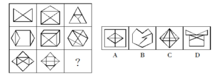 【答案】B【解析】圖形比較凌亂,但整體來看第一橫行曲線條數(shù)為:0、1、2;第二橫行曲線條數(shù)為2、0、1,;雖無遞變規(guī)律,但一、二橫行曲線條數(shù)之和均為3。第三橫行曲線條數(shù)為1、2、?,故應(yīng)為0條曲線,選B。