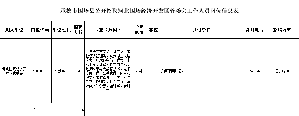 根據(jù)《承德市事業(yè)單位公開招聘工作人員暫行辦法》(承人社〔2011〕87號)文件精神,結(jié)合河北圍場經(jīng)濟開發(fā)區(qū)管委會2023年招聘計劃和崗位空缺情況,經(jīng)縣委、縣政府研究,決定面向社會公開招聘河北圍場經(jīng)濟開發(fā)區(qū)管委會工作人員14名,具體方案如下: