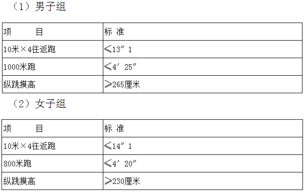 按照《關(guān)于印發(fā)<公安機(jī)關(guān)錄用人民警察體能測(cè)評(píng)項(xiàng)目和標(biāo)準(zhǔn)(暫行)>的通知》(人社部發(fā)〔2011〕48號(hào))執(zhí)行。如果在體能測(cè)評(píng)前國家出臺(tái)新的體能測(cè)評(píng)標(biāo)準(zhǔn),則按國家有關(guān)部門新的體能測(cè)評(píng)標(biāo)準(zhǔn)執(zhí)行。具體條件如下: