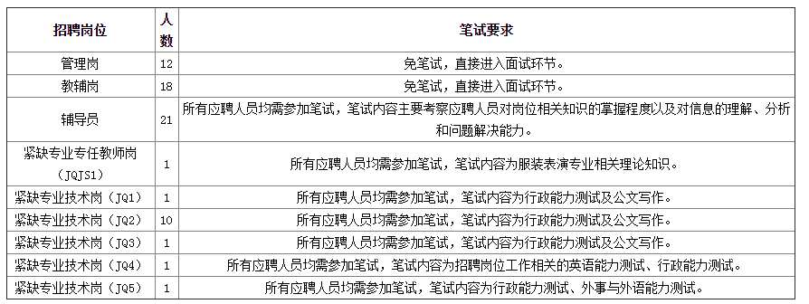 ?。?)筆試為閉卷考試,滿分為100分,合格分?jǐn)?shù)線為60分,招聘崗位及相應(yīng)筆試要求詳見表1。低于合格分?jǐn)?shù)線的應(yīng)聘人員,不再進(jìn)入面試環(huán)節(jié)。