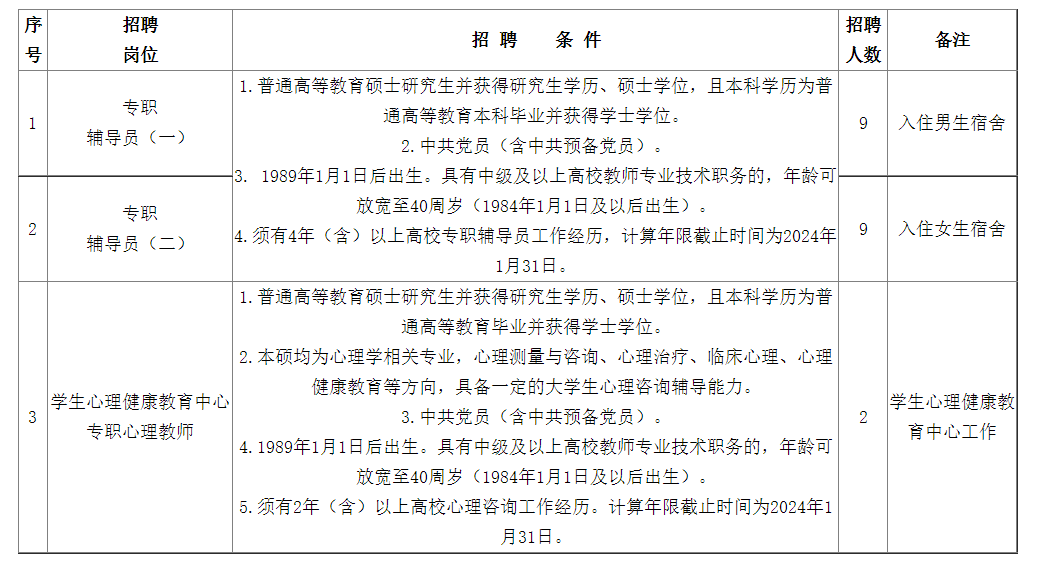 6.應(yīng)聘專職輔導(dǎo)員崗位須有4年(含)以上高校專職輔導(dǎo)員工作經(jīng)歷,應(yīng)聘學(xué)生心理健康教育中心專職心理教師崗位須有2年(含)以上高校心理咨詢工作經(jīng)歷。計(jì)算年限截止時(shí)間為2024年1月31日。