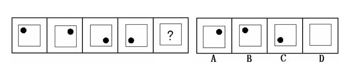 ?。ù鸢福築。黑點(diǎn)在正方形中順時(shí)針移動(dòng)。在第5個(gè)圖形中,應(yīng)該正好移動(dòng)到左上角。)