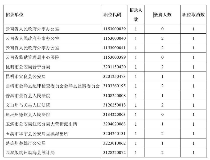 云南省2024年度考試錄用公務員網(wǎng)上報名、資格審查及繳費工作已結(jié)束。根據(jù)《云南省2024年度考試錄用公務員公告》,結(jié)合網(wǎng)上報名、資格審查、繳費情況,云南省公務員局決定取消14個招考職位(詳見附件)。