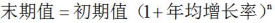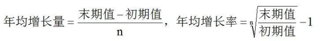 注:初期值是指一個(gè)時(shí)間段內(nèi)的第一年;末期值是指一個(gè)時(shí)間段內(nèi)的最后一年;n是指增長次數(shù)(通常用年份差來代替)。