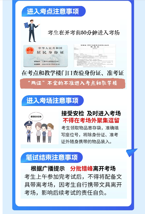 ?。ㄋ模┛忌陂_考前50分鐘須攜帶紙質(zhì)準(zhǔn)考證和有效居民身份證原件或臨時(shí)居民身份證進(jìn)入考點(diǎn),兩證不全者不得進(jìn)入考點(diǎn)考場。本次筆試公安部門出具的帶有本人照片的“戶籍證明”不視為有效身份證件。