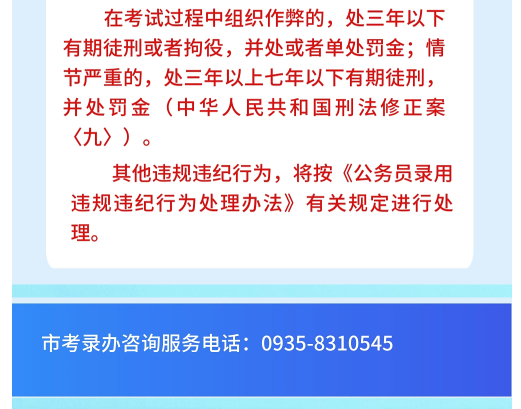 ?。ㄊ┛忌氄J(rèn)真閱讀筆試有關(guān)規(guī)定,遵守考場規(guī)則,服從考務(wù)人員管理,接受監(jiān)考人員的監(jiān)督和檢查。對(duì)有作弊行為、無理取鬧、不配合考務(wù)人員進(jìn)行相關(guān)詢問等造成嚴(yán)重后果的,或威脅、侮辱、誹謗、誣陷工作人員或其他考生的,將按《公務(wù)員錄用違規(guī)違紀(jì)行為處理辦法》等相關(guān)規(guī)定嚴(yán)肅處理。替考、電子作弊等違反《中華人民共和國刑法修正案(九)》等法律法規(guī)構(gòu)成犯罪的,依法追究刑事責(zé)任。
