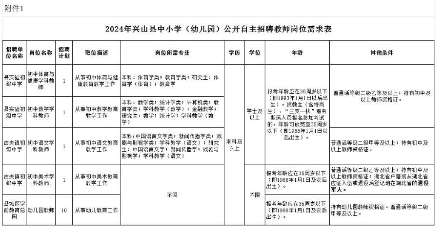 2.報考自主招聘中小學(xué)(幼兒園)教師崗位條件以《2024年興山縣中小學(xué)(幼兒園)公開自主招聘教師崗位需求表》(附件1)為準(zhǔn)。