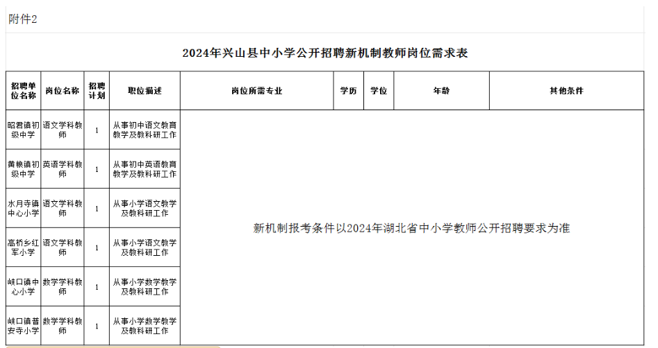 附件2:2024年興山縣中小學(xué)公開招聘新機(jī)制教師崗位需求表
