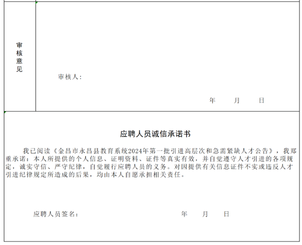 2.報(bào)名方式:采取網(wǎng)上報(bào)名和現(xiàn)場(chǎng)報(bào)名相結(jié)合的方式進(jìn)行。報(bào)名前,應(yīng)聘人員認(rèn)真查閱《公告》,仔細(xì)閱讀“應(yīng)聘人員誠(chéng)信承諾書”和引進(jìn)崗位條件,填寫《金昌市永昌縣教育系統(tǒng)2024年第一批引進(jìn)高層次和急需緊缺人才報(bào)名表》(見附件2,以下簡(jiǎn)稱《報(bào)名表》),每位應(yīng)聘者只允許選擇填報(bào)1個(gè)崗位,各崗位具體引進(jìn)條件以《崗位簡(jiǎn)表》為準(zhǔn)。因個(gè)人填報(bào)信息錯(cuò)誤而導(dǎo)致的其他后果,由應(yīng)聘者本人承擔(dān)。應(yīng)聘人員提供的報(bào)名材料應(yīng)真實(shí)準(zhǔn)確,偽造或變?cè)煊嘘P(guān)證件、材料、信息,提供虛假報(bào)名材料的應(yīng)聘人員,一經(jīng)發(fā)現(xiàn)即取消資格并按照有關(guān)規(guī)定處理。