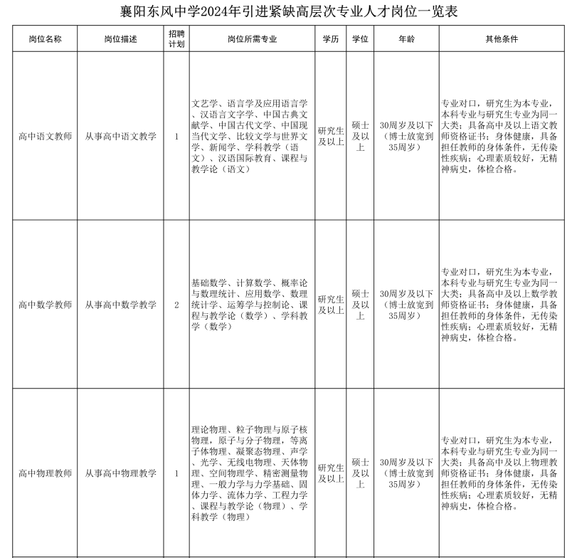 2.襄陽東風(fēng)中學(xué)2024年緊缺高層次人才引進(jìn)崗位表
