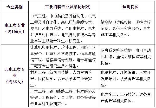招聘專業(yè)指主修專業(yè)(不包含輔修專業(yè))。招聘專業(yè)主要為電工類專業(yè),少量招聘非電工類專業(yè)。根據(jù)2024年第一批招聘畢業(yè)生流失情況,進行少量補招。最終招聘數(shù)量將根據(jù)上級單位核定情況相應調整,主要招聘計劃如下: